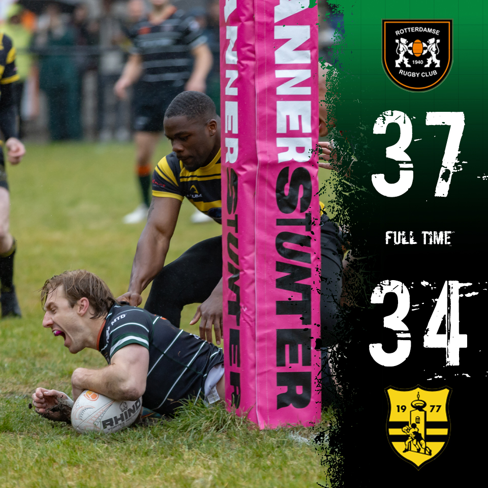De wedstrijd was zo goed als over en verlenging dreigde maar toen volgde een werkelijk briljante actie. Na 13 !! fases in de Amersfoortse 22 wist scrum half Tom Alloway de bal uiteindelijk perfect aan te gooien naar de eveneens perfect gepositioneerde Will Maddocks die met een dropkick waar Jonny Wilkinson trots op zou zijn, de 3 winnende punten binnen schoot aangezien de ref hierna direct affloot. Spelers, staff en de massaal opgekomen supporters van Rotterdam ontplofte collectief van trots en vreugde want de finale was bereikt. Het was dan ook nog lang onrustig op en om het veld waarbij het ongeloof bij veel mensen van het gezicht te lezen viel.